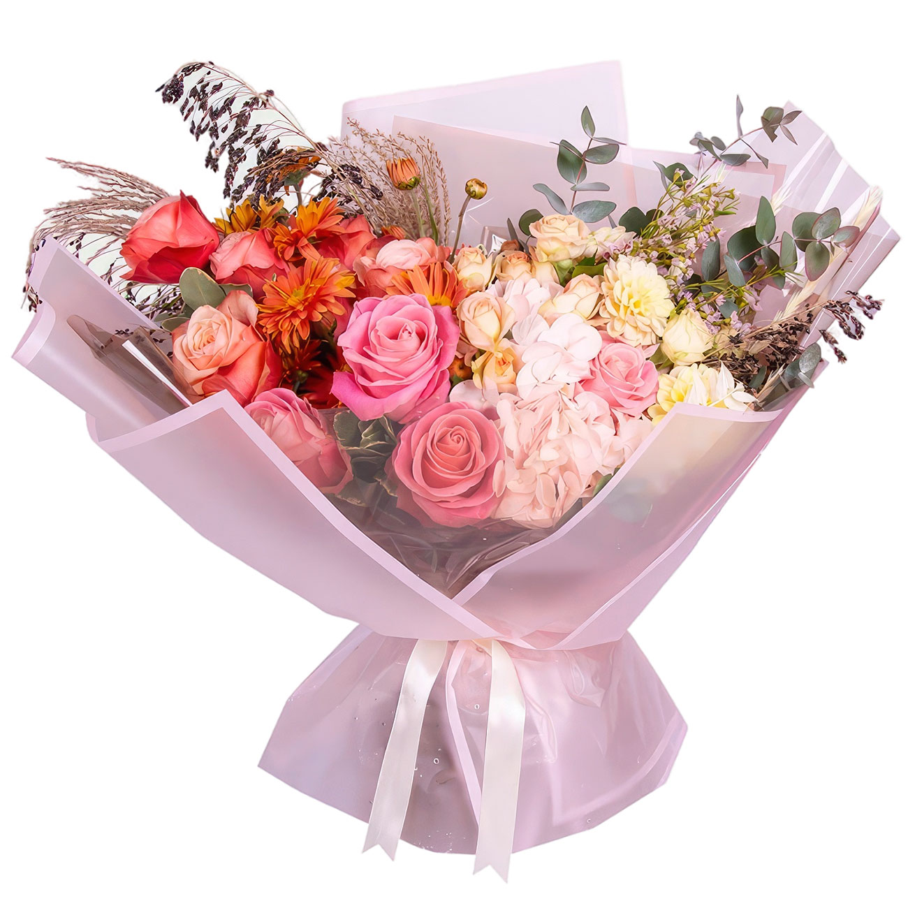 Гортензия нежно-розовая, георгина кремовая, роза одноголовая розовая и персиковая, роза кустовая кремовая, хризантема кустовая оранжевая, хамелеон, эвкалипт, зелень, экзотические сухоцветы. Упаковка (лента, пленка, крафт, сетка, пленка матовая)