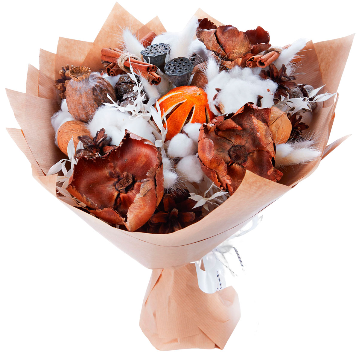 Орех грецкий, хлопок, лотос, лагурус, шишки, сухоцветы. Упаковка (лента, пленка, крафт, сетка, пленка матовая)