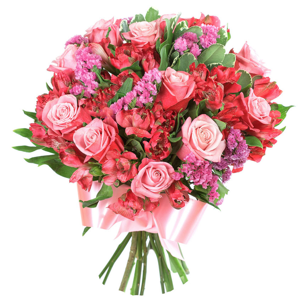 Роза одноголовая розовая, альстромерия красная, статица сиреневая, зелень. Упаковка (лента, пленка, крафт, сетка, пленка матовая)