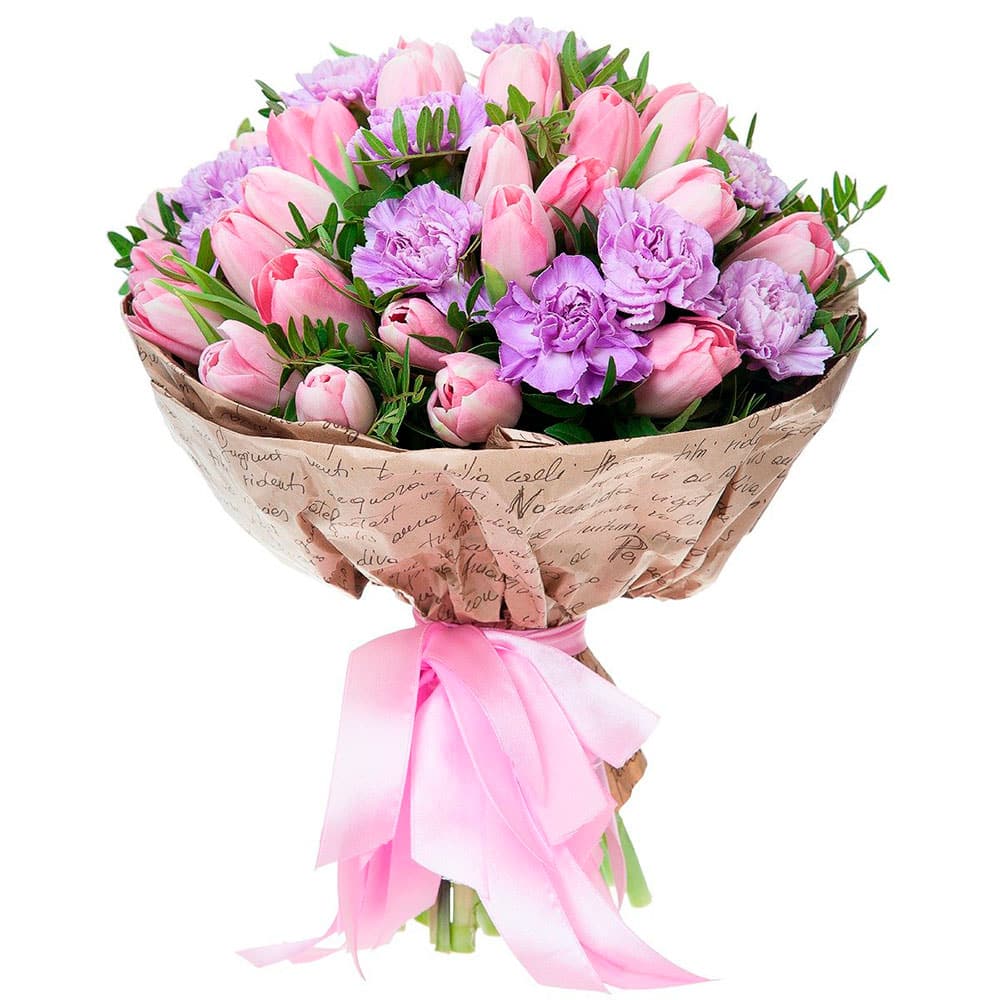 Тюльпан розовый, гвоздика сиреневая, фисташка. Упаковка (лента, пленка, крафт, сетка, пленка матовая)
