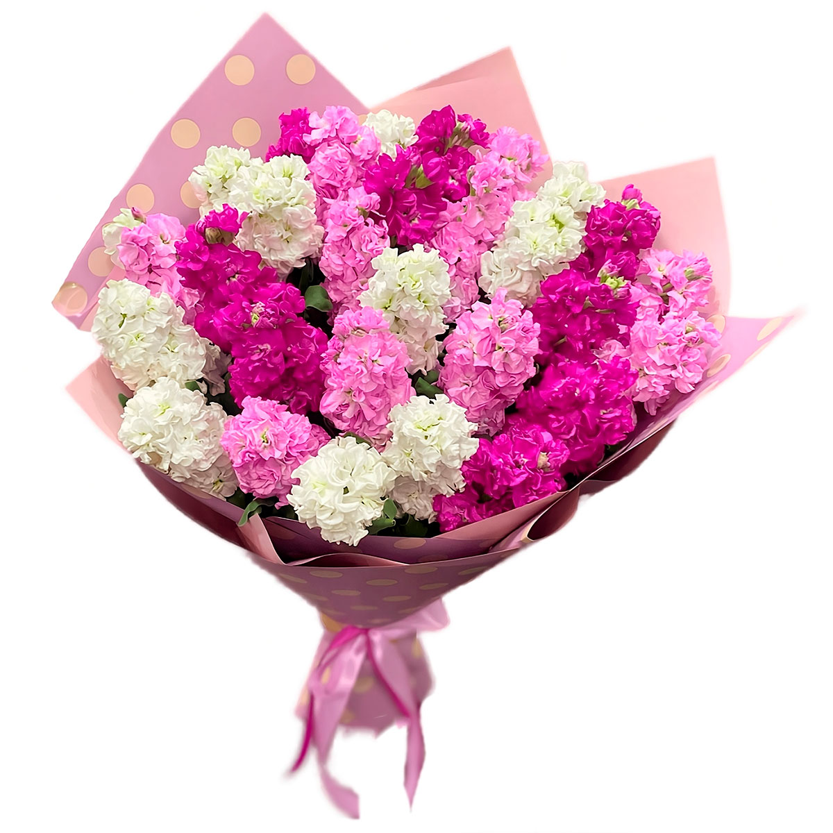 Маттиола розовая, нежно розовая, белая. Упаковка (лента, пленка, крафт, сетка, пленка матовая)