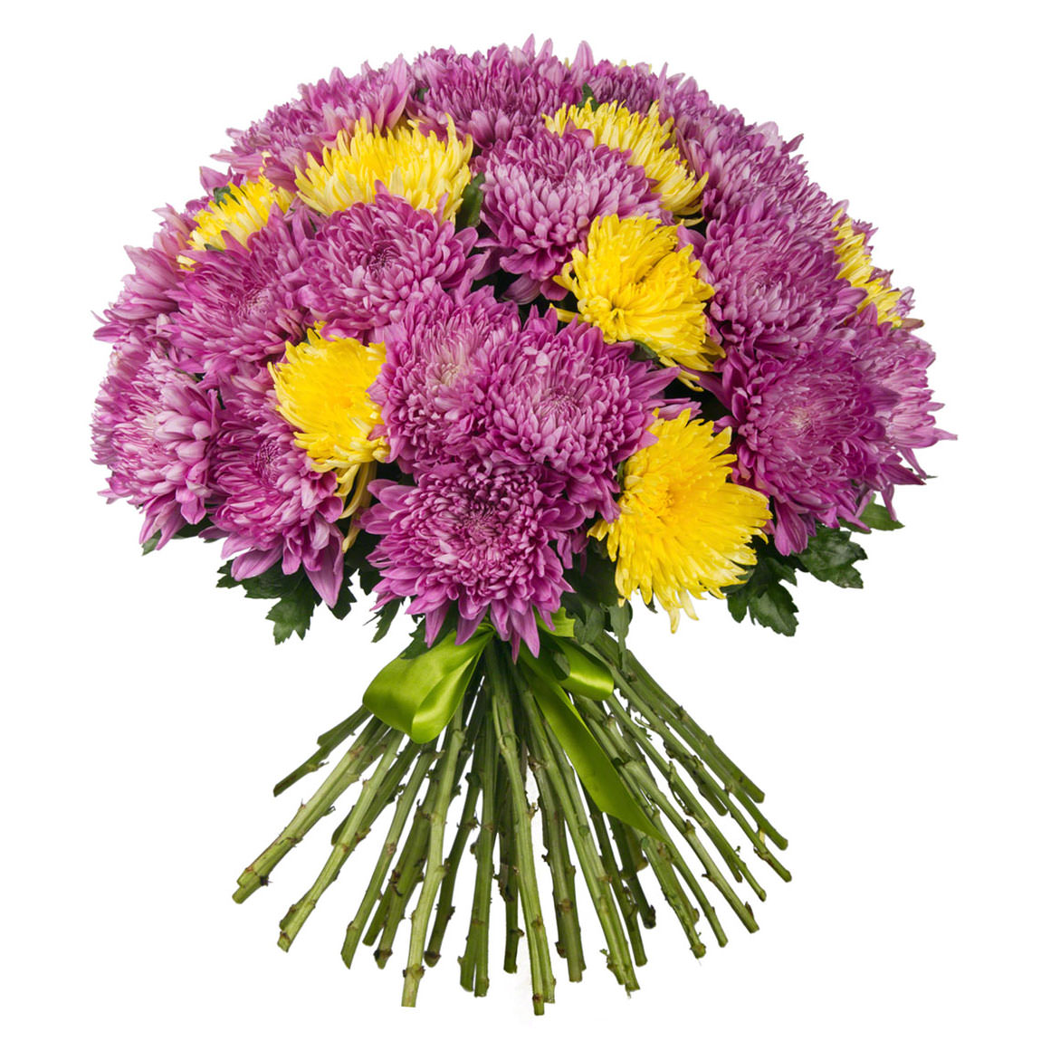 Одноголовые желтые, фиолетовые хризантемы.