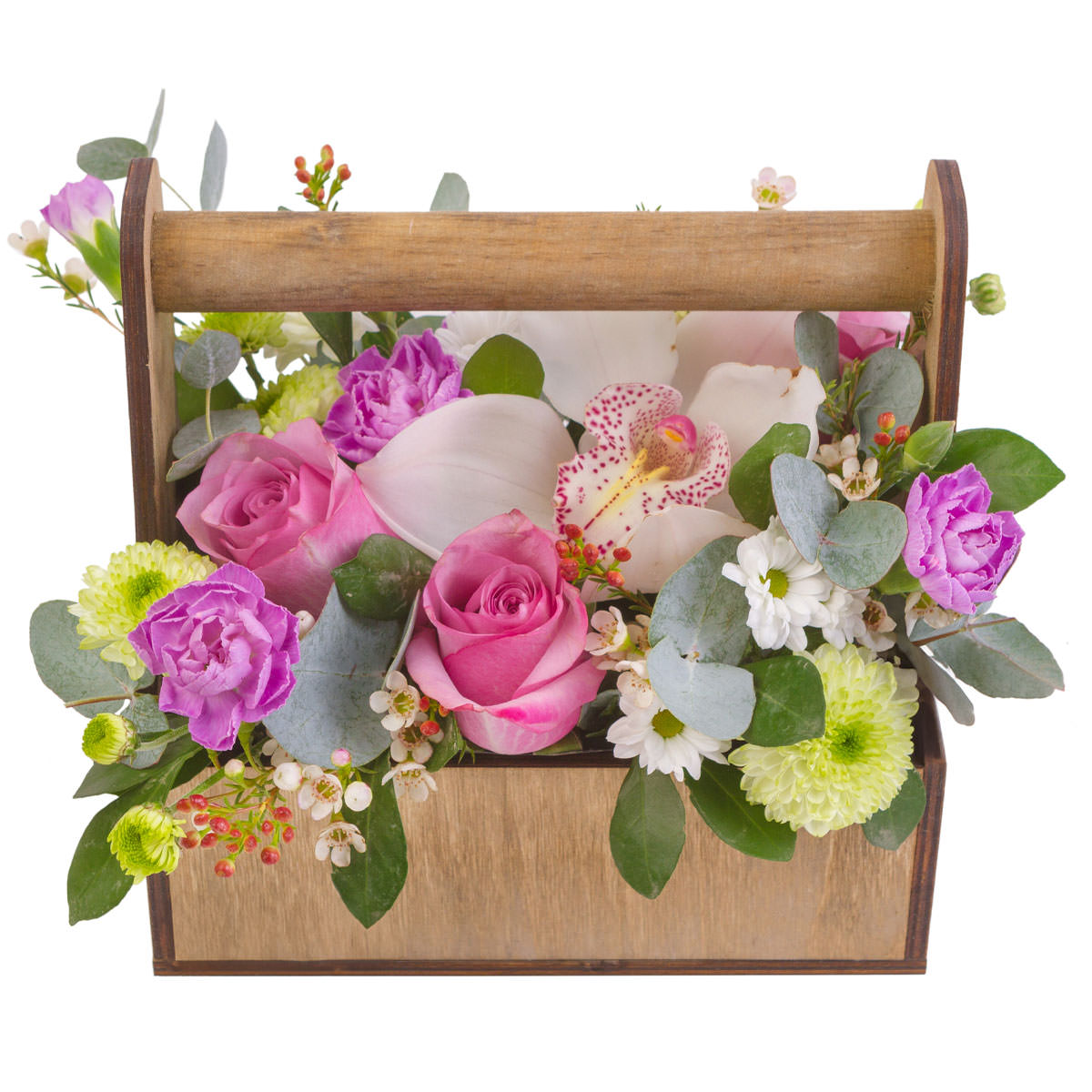 Орхидея белая, роза одноголовая розовая, гвоздика сиреневая, хризантема кустовая белая и зеленая, ваксфлауэр, гиперикум, эвкалипт. Упаковка (Корзина, оазис, ящик).