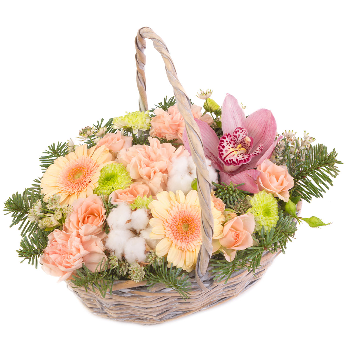 Орхидея розовая, гербера персиковая, роза одноголовая персиковая, гвоздика персиковая, хризантема кустовая зеленая, хлопок, пихта. Упаковка (Корзина, оазис, ящик).