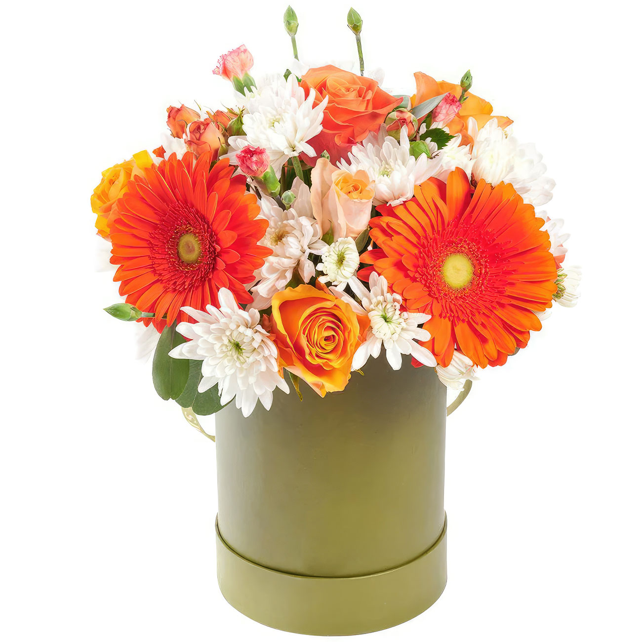 Гербера оранжевая, роза кустовая оранжевая, хризантема кустовая белая, гвоздика кустовая мини розовая, роза одноголовая оранжевая. Упаковка (шляпная коробка, квадратный бокс, коробка сердце, оазис)