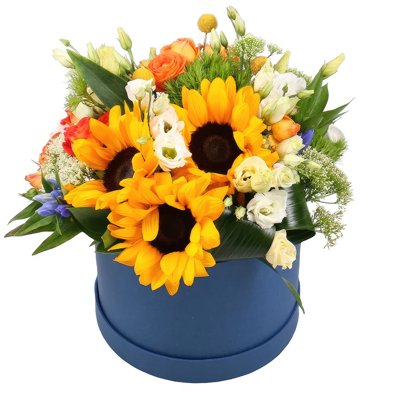 Цветы в коробке «Подсолнечное настроение» с доставкой по г Архангельск: вы можете заказать букет в цветочном салоне «Флормания» по цене от 2990 руб.