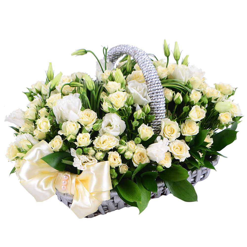 Роза кустовая кремовая, эустома белая, зелень. Упаковка (Корзина, оазис).